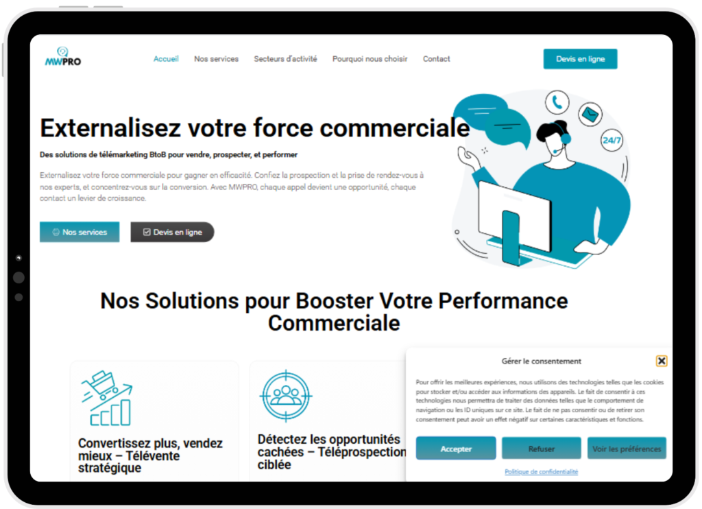 Le site MWPRO offre aujourd’hui une expérience utilisateur fluide, moderne et professionnelle. Grâce à un design sur mesure et une structure claire, il permet à l’entreprise de présenter efficacement ses services. L’ensemble du projet a été réalisé sans thème payant, démontrant une maîtrise des outils WordPress, Elementor et Canva, ainsi qu’une capacité à produire un site complet, cohérent et performant.